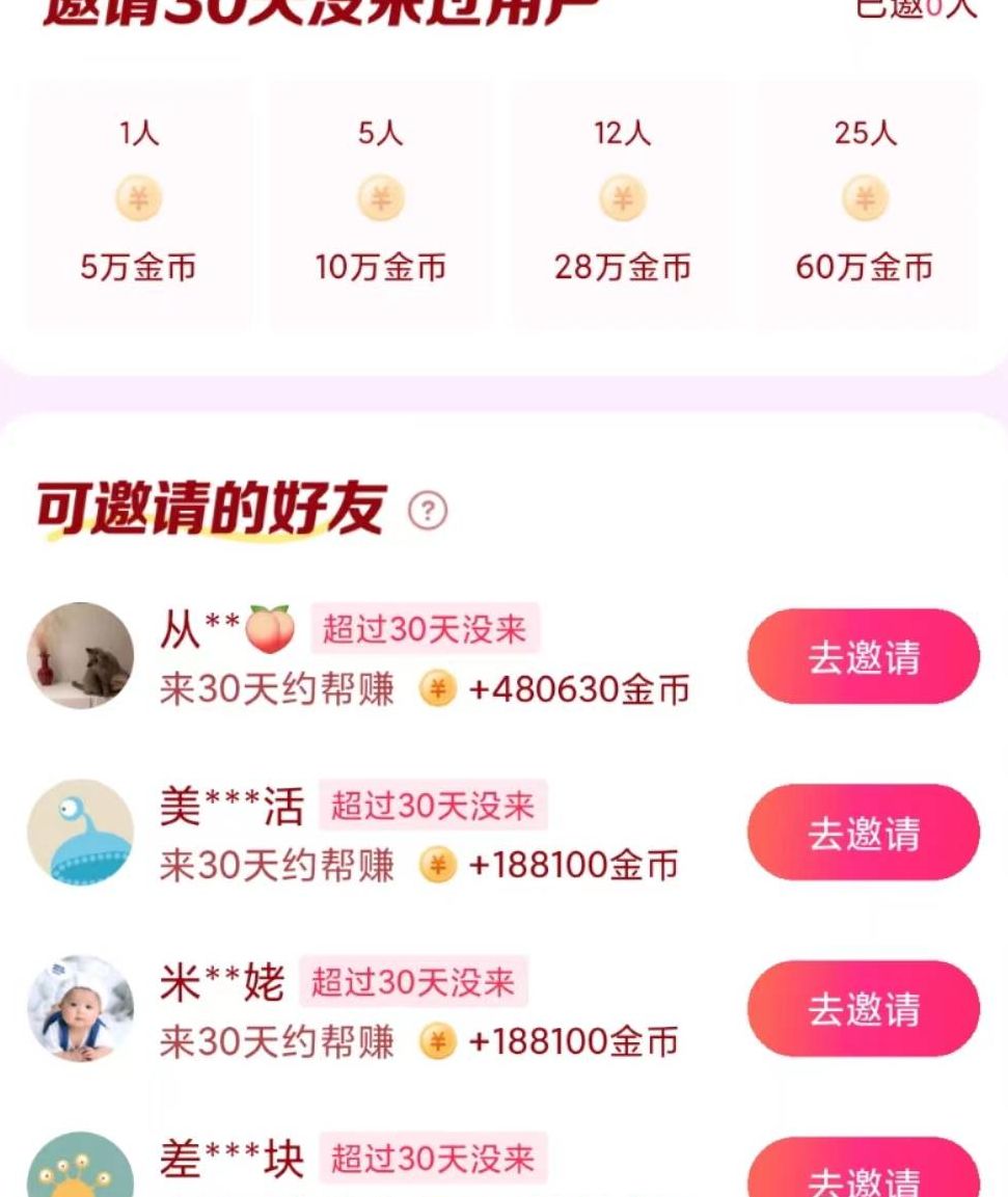 这里说的老用户,指的是超过30天未登录过抖音极速版的用户。这类用户的回归能有效提升平台活跃度,所以成功邀请身边符合条件的用户回归,你就能拿到相应奖励,奖励通常分30天发放,虽然周期长了点,但也是一笔实实在在的收益。除此之外,你邀请的用户活跃度越高,也能带动你自己看广告、刷视频的金币收益不断提升。