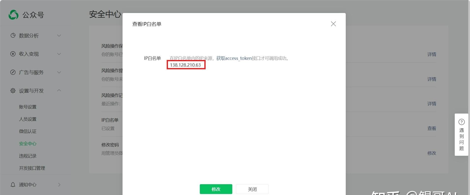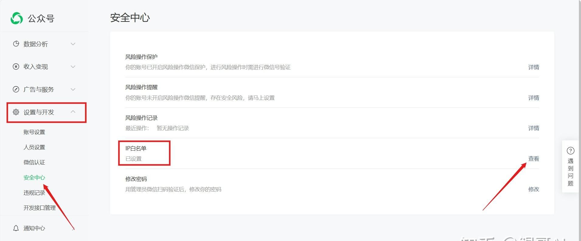 打开公众号后台,依次点击【设置与开发】,【安全中心】
