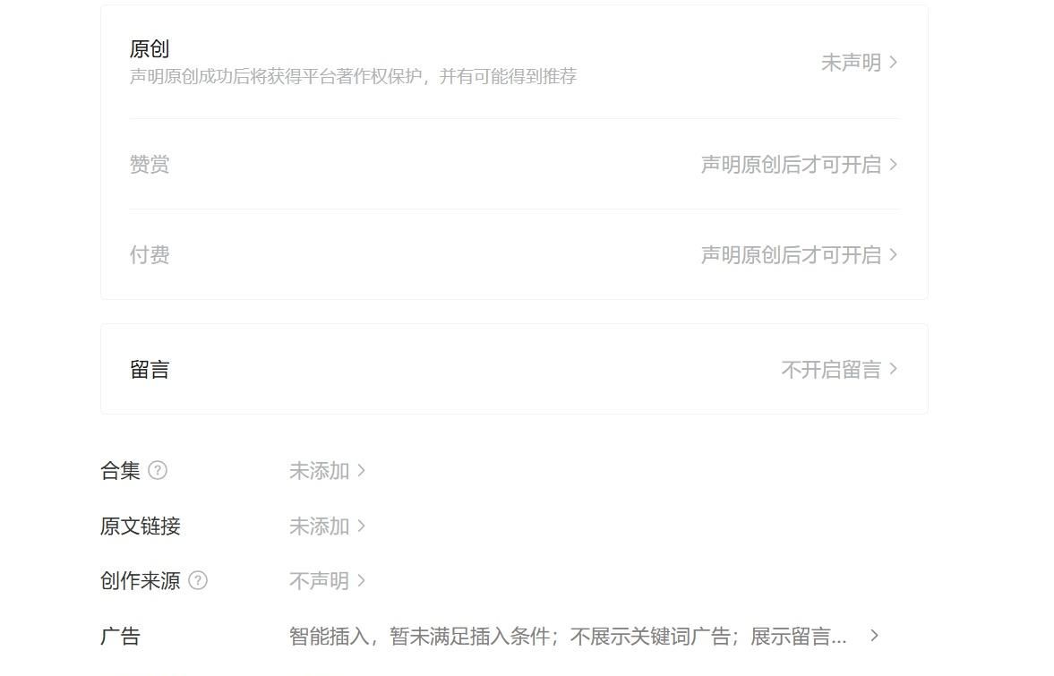 找到已经上传好的文章,开启原创声明、留言功能和底部流量主广告。