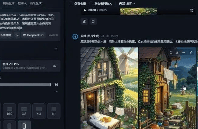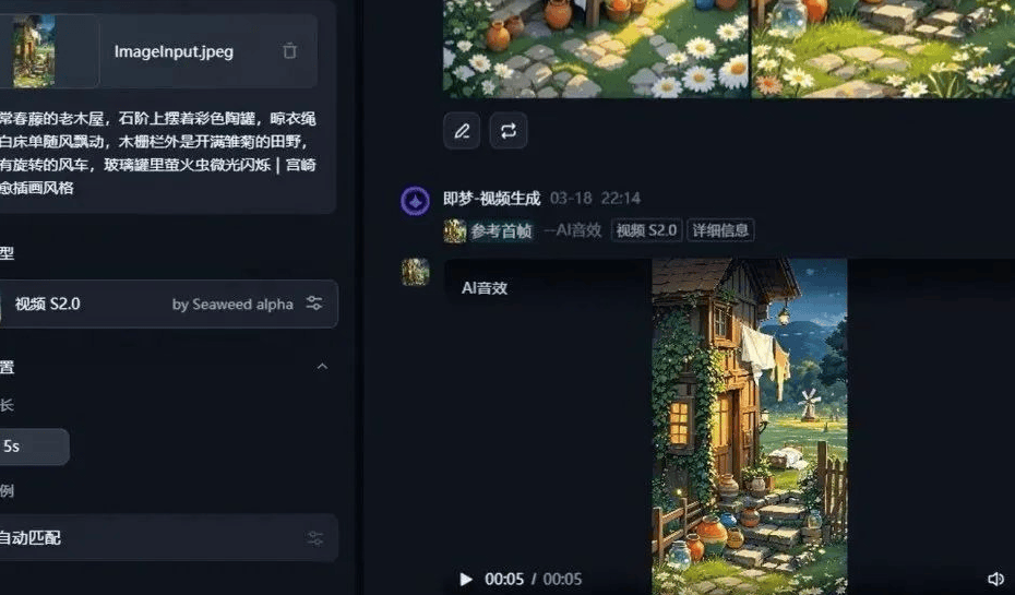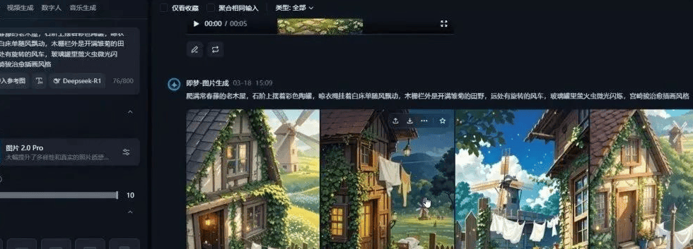 4. 生成视频+配音:选中刚生成的图片,点“生成视频”,再把提示词复制一遍(比如“图片转5秒动画,添加微风、鸟叫音效”),选视频模型生成,生成后点“AI配音”(选温柔女声),下载到手机或电脑桌面备用(建议生成3-4个小片段)。