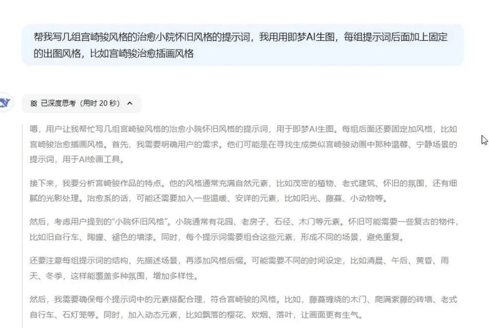 2. 搞定提示词:打开提示词生成器,点“深度思考”和“联网搜索”,复制我给的提示词模板,粘贴发送后,工具会自动生成一堆生成图片的关键词。
