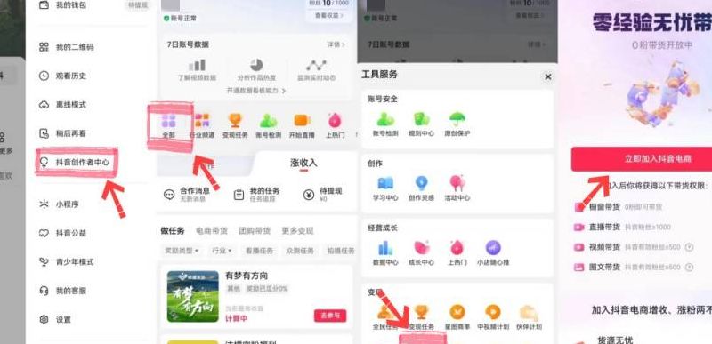 打开抖音APP,点击底部导航栏的「我」,再点击右上角的三条横线图标,在弹出的右侧菜单栏中选择「抖音创作者中心」;进入页面后点击「全部」,在「变现」板块里选择「电商带货」,点击「立即加入抖音电商」,完成后续的一系列认证流程后,就能开通图文带货权限了。