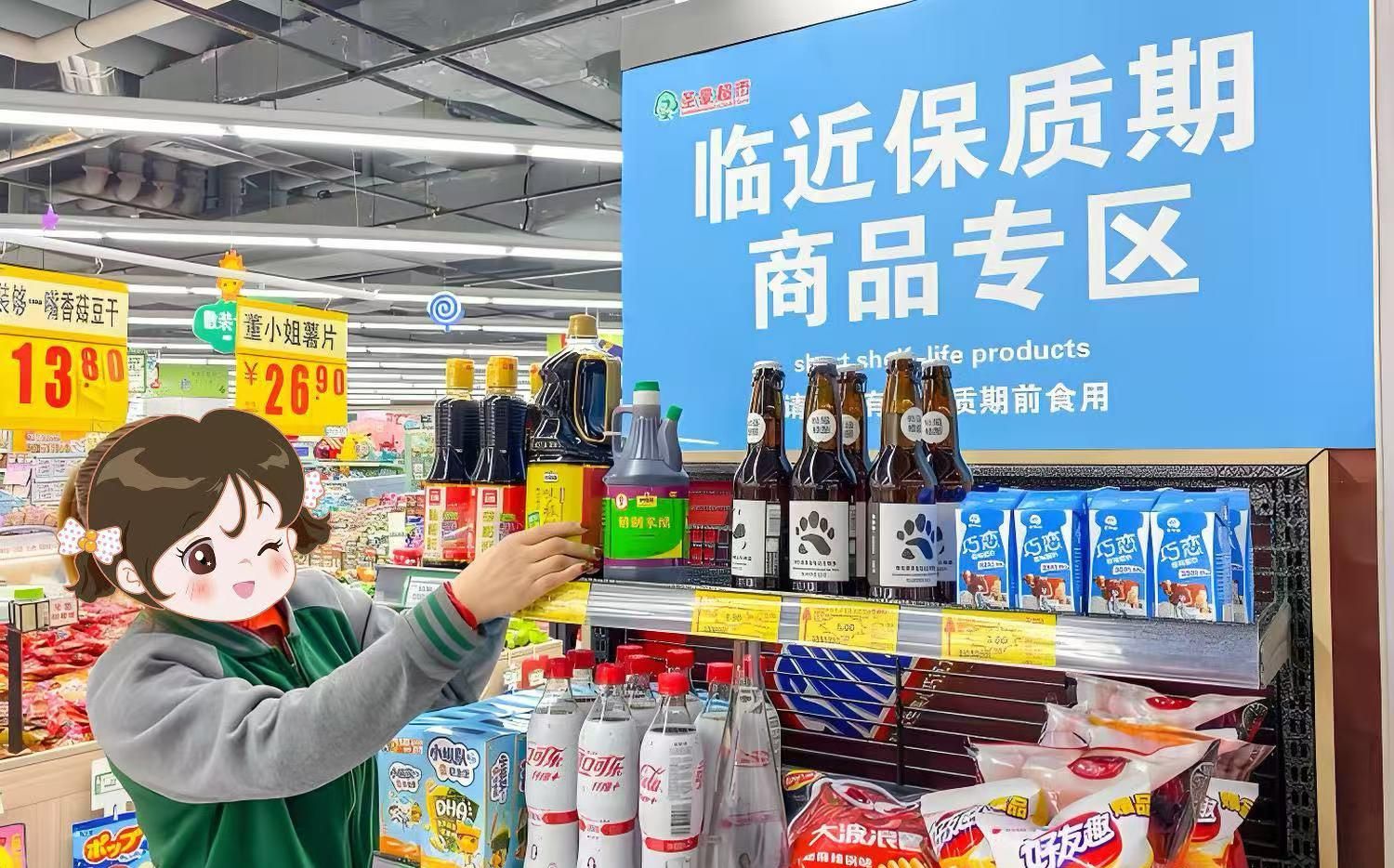 超市里多了些特殊货架,贴着“临期特惠”的标签,总能吸引不少年轻人驻足。