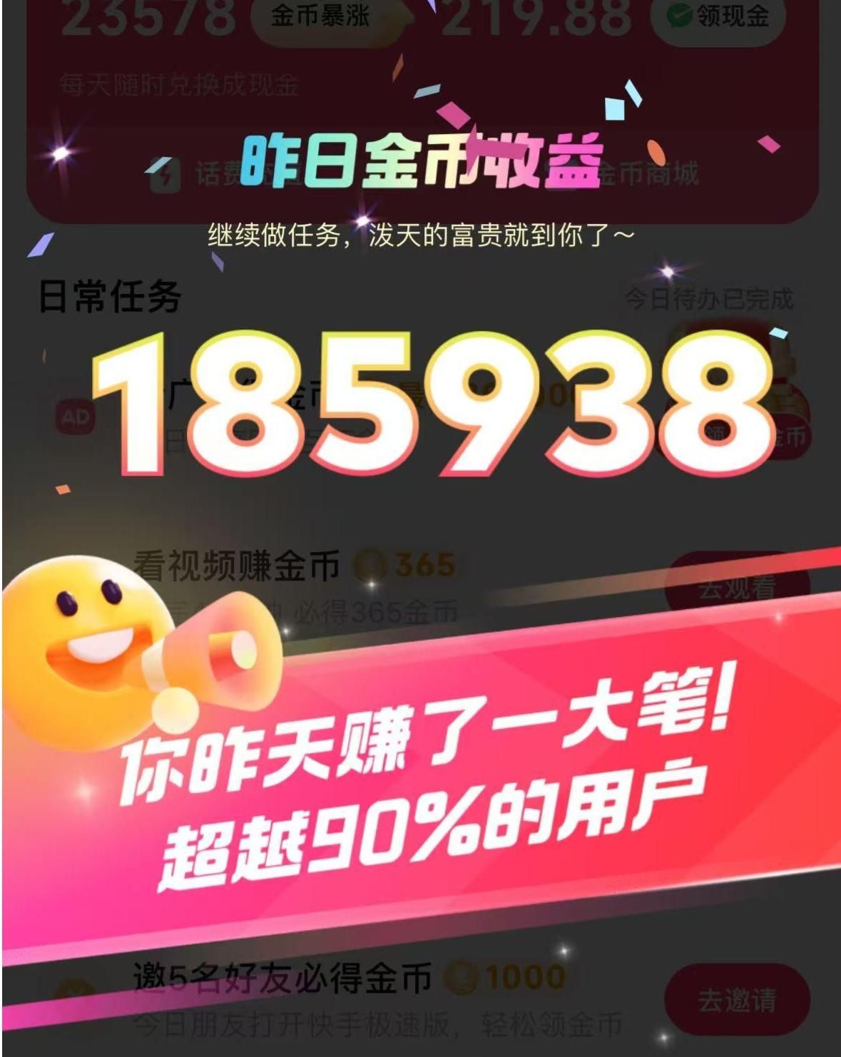 和抖音极速版类似,快手极速版也设置了看视频、完成任务、邀请新用户等多种赚钱渠道。