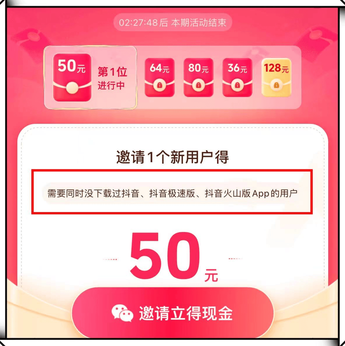 先看官方任务后台的抖音极速版拉新推广任务,从图示信息可清晰了解到,单用户拉新佣金为50元。不过官方任务对用户资质要求相对严格,需同时满足未下载过抖音、抖音极速版、抖音火山版的纯新用户条件,这类用户在实际推广中较难获取。