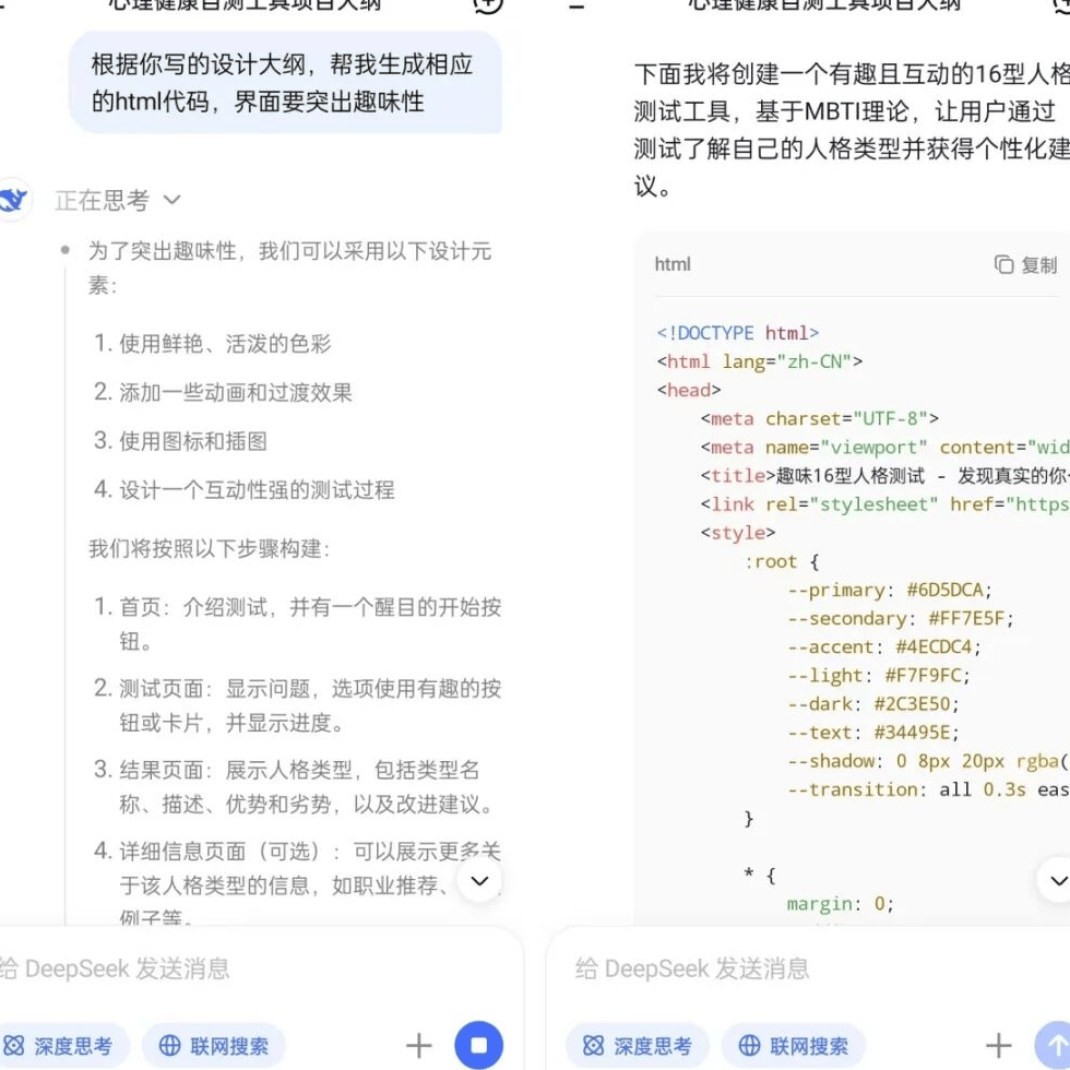 为什么这次没选用之前提到的豆包呢?主要原因是豆包生成的程序界面较为简陋、功能体验不佳,整体体验远比不上 DeepSeek,所以这次直接用 DeepSeek 来制作,操作更顺畅、成品也更精致美观。用 AI 做测试程序有一套万能模板,三步就能搞定,完全不用懂编程:第一步跟 AI 说清需求(比如“做一款小红书热门性格测试,能答题、出结果、给建议”);第二步让 AI 先输出设计大纲;第三步让 AI 按大纲编写代码,全程无需自己动手。