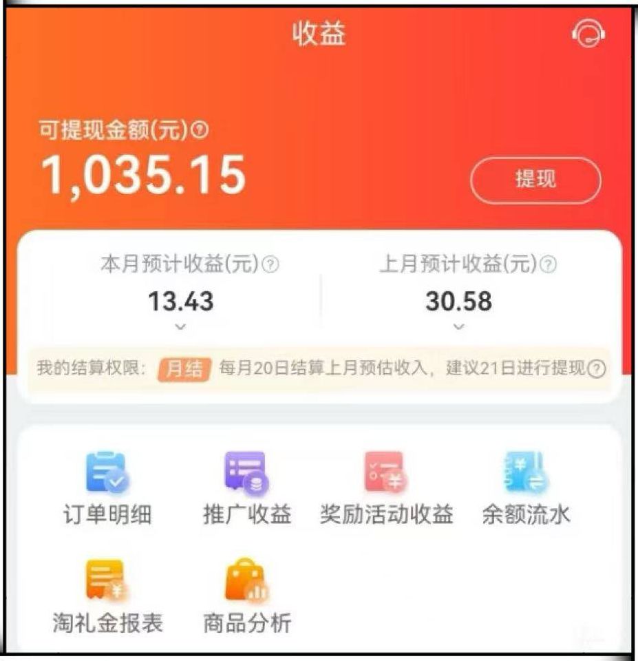 我们可以挑选一些高佣金的商品生成推广链接,然后分享到朋友圈、微信群或小红书等社交平台,吸引他人下单购买,就能获得相应比例的佣金奖励。要是执行力够强,一天收益可达150-300元,而且基本都是日结,收益可以直接提现到支付宝,没有任何门槛,完全可以当作长期兼职来做。