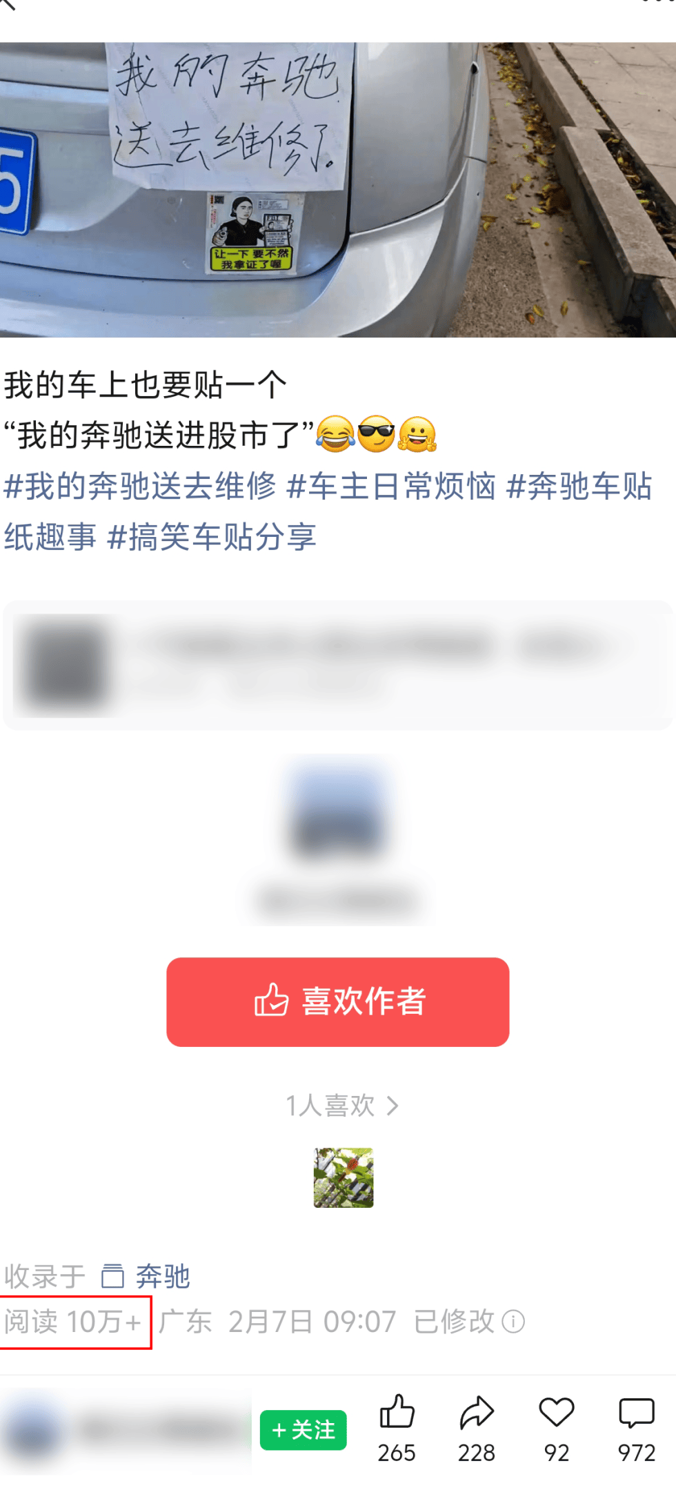 比如我见过一篇10W+阅读的贴图,只是博主在路上随手拍了一辆汽车的照片,配了两句话,就轻松获得了10W+的流量。