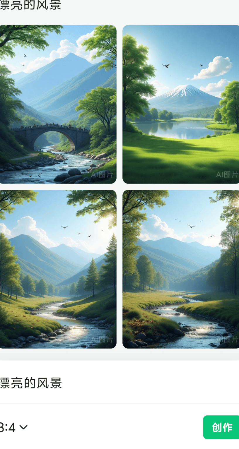 AI生图则是靠提示词描述你想要的图片,在输入框输入提示词后点击创作,就能一键生成符合需求的图片。