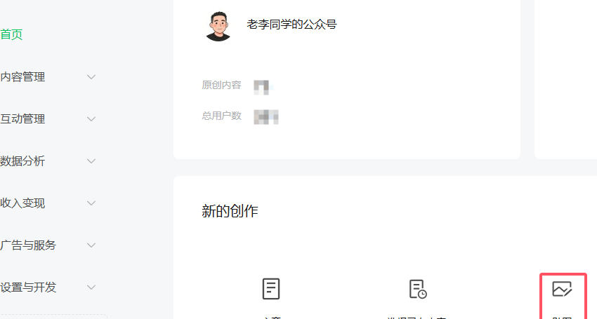 在PC端发布贴图,需要先登录公众号后台,然后在「新创作」选项中点击贴图。