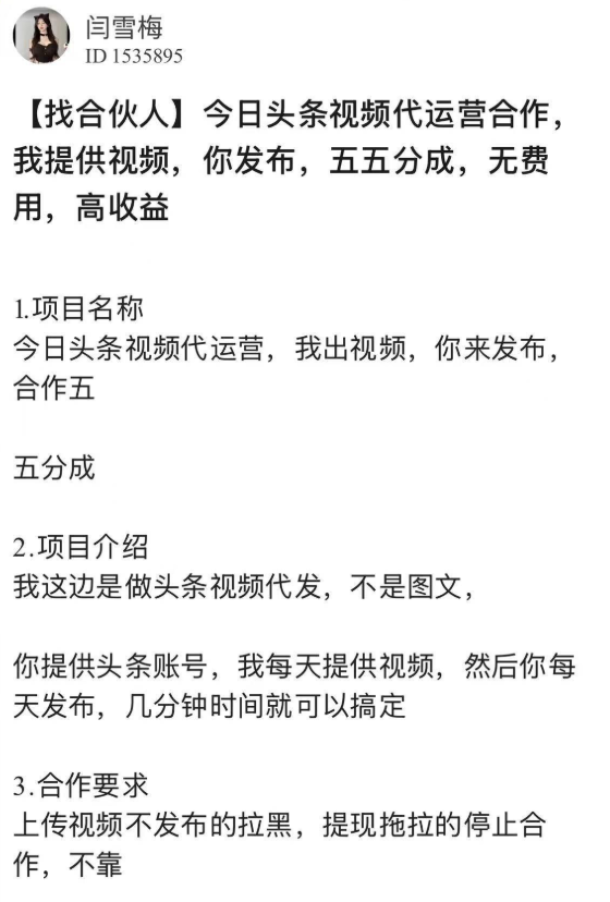 就是由合作方提供现成的视频素材,你出账号发布,赚到的收益双方五五分成,不用自己费心做内容。