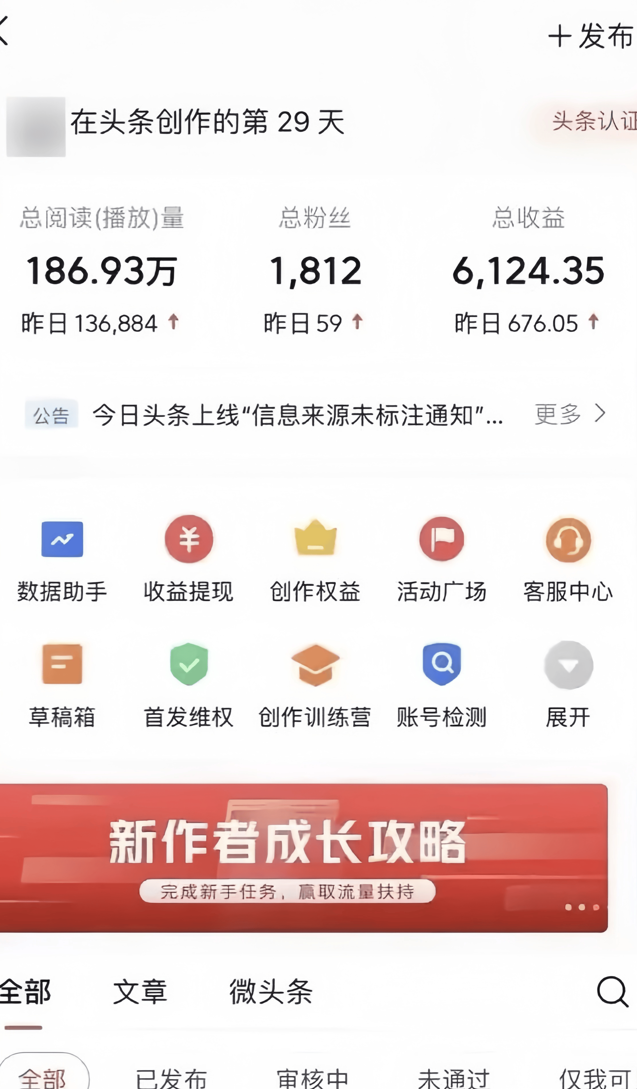 咱们社群就有一位小伙伴,一条微头条直接爆火,拿下了137万+的阅读量——而他的账号注册还不到一个月,单日收益就冲到了670元,这个成绩相当惊人!