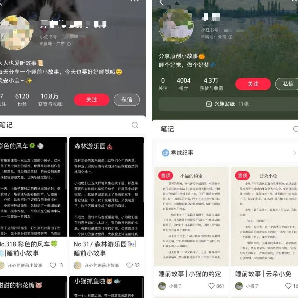 这些账号的内容定位非常清晰:主打哄睡儿童的童话故事内容,核心受众锁定宝妈群体。结合小红书平台以女性用户为核心的生态特质,这类内容天生就自带粉丝快速增长的优势。