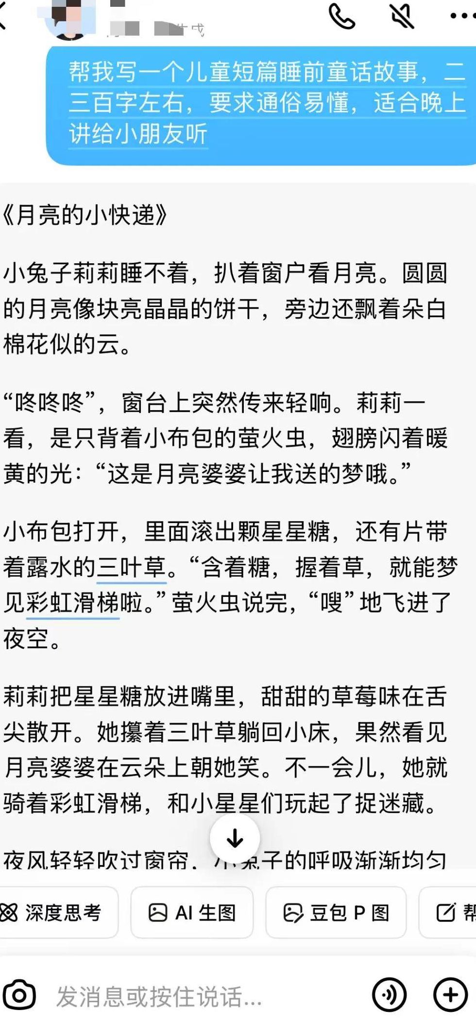 第一步,打开AI工具(比如豆包),输入明确的指令,生成一篇符合要求的睡前故事文案。