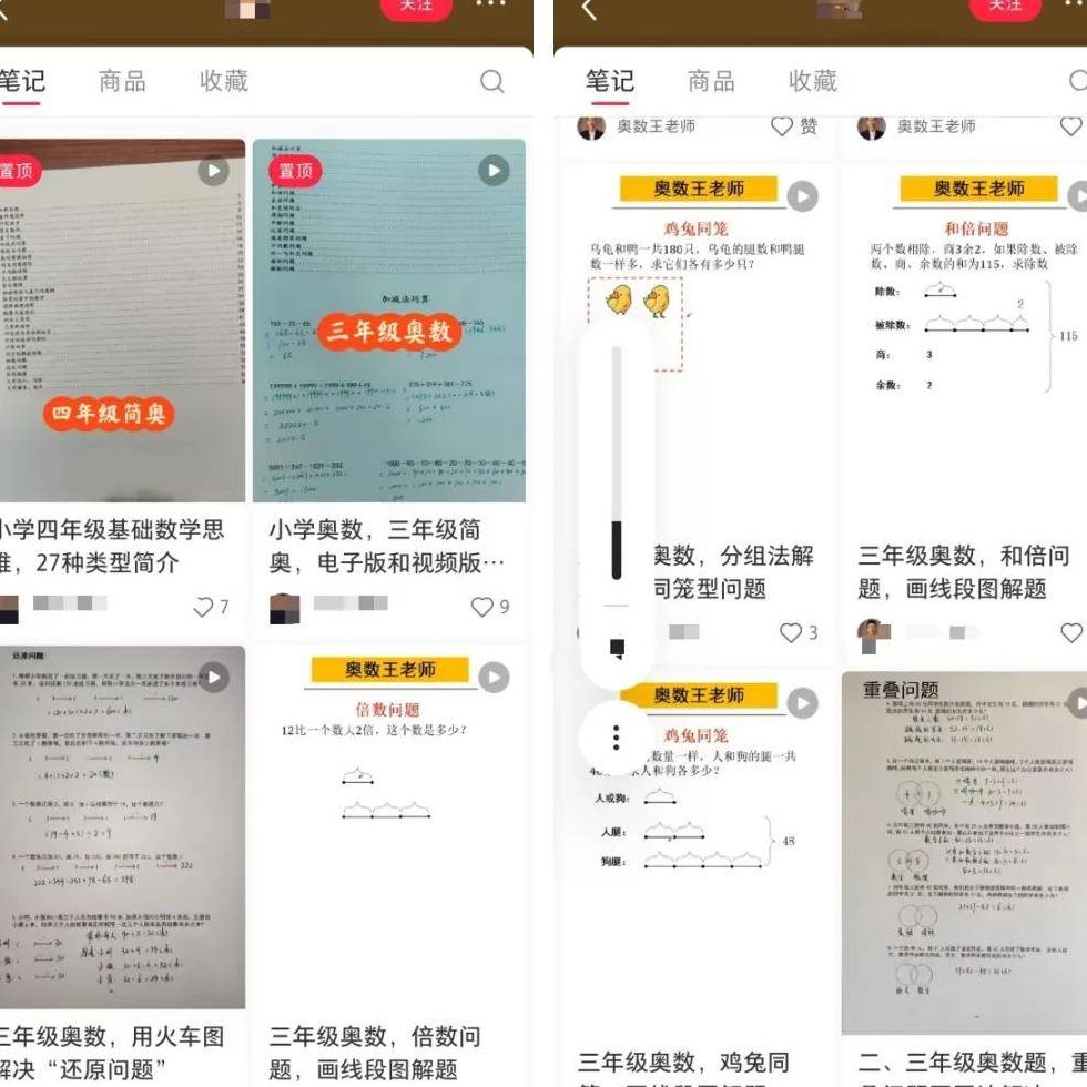 你看图片1,他发布的内容主要是小学数学题的解答与讲解。注意,他只做数学学科,不涉及其他科目,且所有笔记均为视频形式。这种聚焦策略非常值得借鉴。