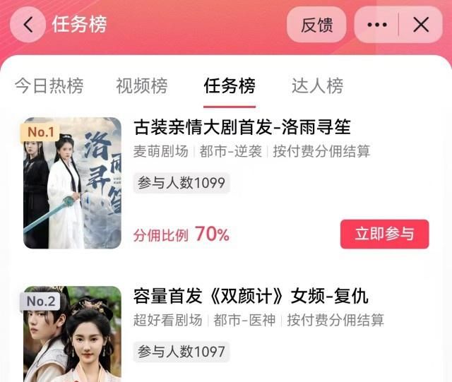 抖音的巨量星图设有短剧频道,这是平台为创作达人提供的短剧授权入口:加入“短剧发行人计划”,即可挑选分佣比例高达70%的热门短剧推广任务。