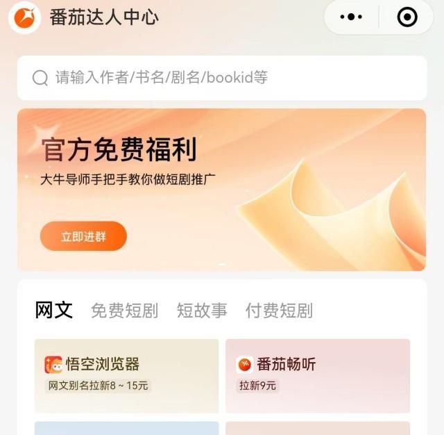 番茄达人中心提供短剧推广与小说推文两类授权,覆盖字节跳动旗下的番茄小说、今日头条、番茄畅听、悟空浏览器、红果短剧、饭余剧场等产品。