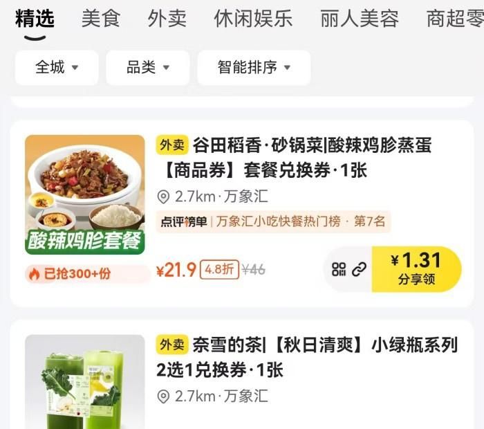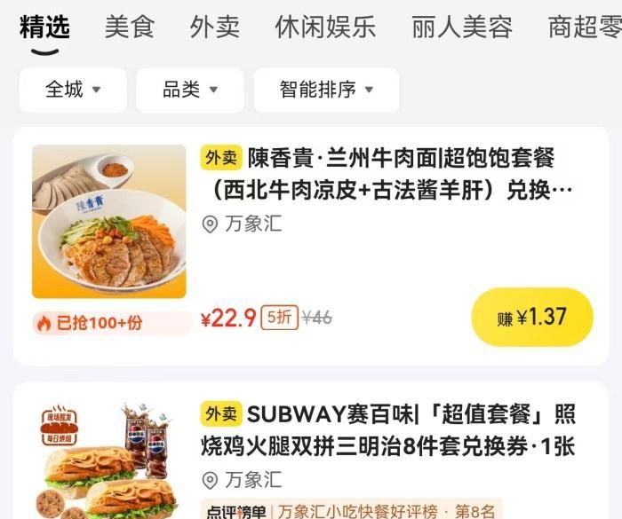 不过与惠省相比,其推广类型更为丰富——除常规的团购、外卖套餐外,还包含美团各类专场优惠券及奖励活动。