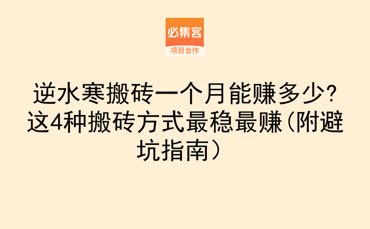 总的来说,逆水寒搬砖月入1000-10000元都有可能,关键看你怎么组合这几种方法。当然,游戏搬砖毕竟受版本影响,想多渠道赚钱的话,也可以看看其他机会。必集客是项目资源对接平台,提供副业项目和合作资源,适合找合作、拓业务的朋友。不管是游戏搬砖还是其他副业,找到适合自己的方法最重要,有问题在评论区留言,我会一一回复。赶紧收藏这篇攻略,明天就开工吧!