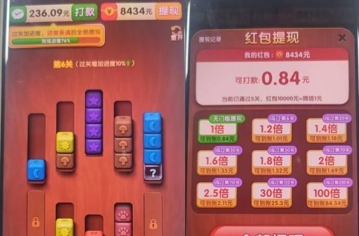这款游戏要求将同色方块移动到同一格子内,直到所有格子颜色统一就算完成。收益机制和上述几款游戏类似,绿色部分自动发放,红色部分满0.1元即可手动提现。