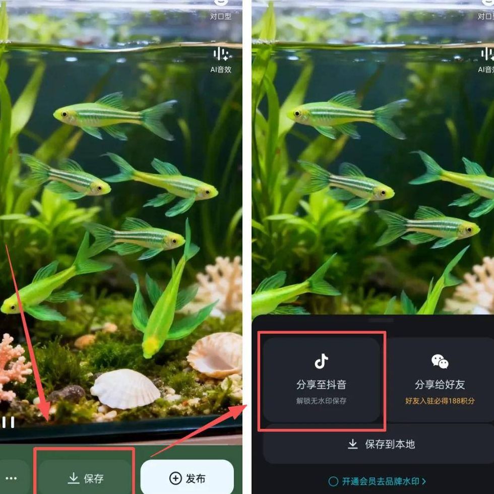 视频生成后,这里有个关键的小技巧要注意:不要直接点击下载,否则视频会带有平台水印。想要无水印保存的话,先打开生成好的视频,点击“保存”按钮,然后选择“分享到抖音”选项。