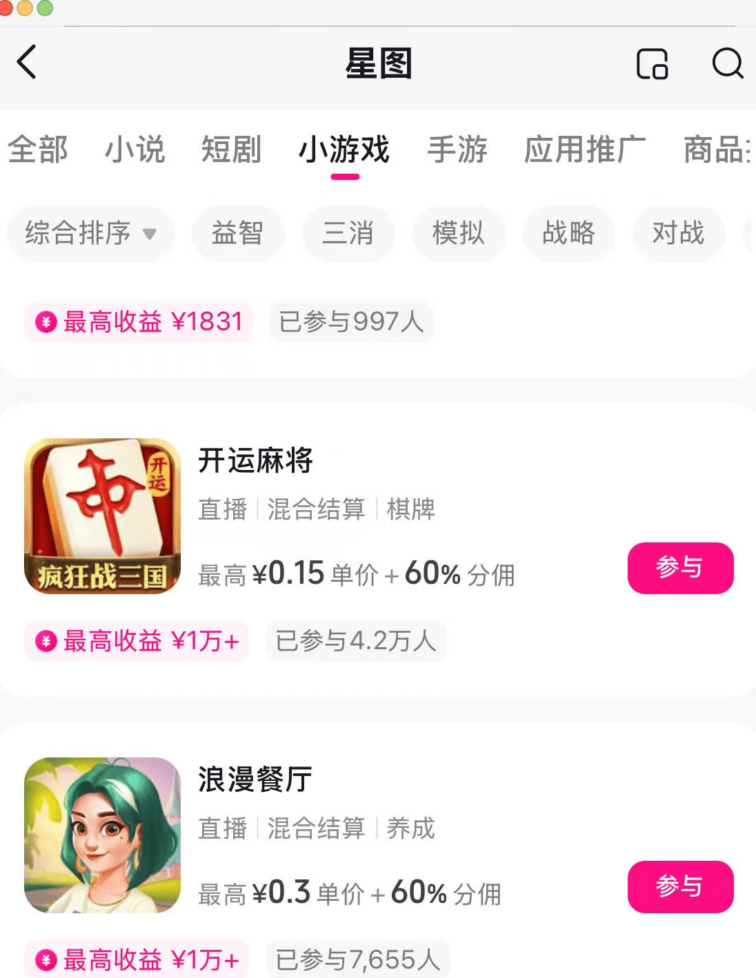 我们在抖音搜索栏里,搜索“巨量星图”,点选“我是达人”,找到小游戏和手游推广任务参与就行。