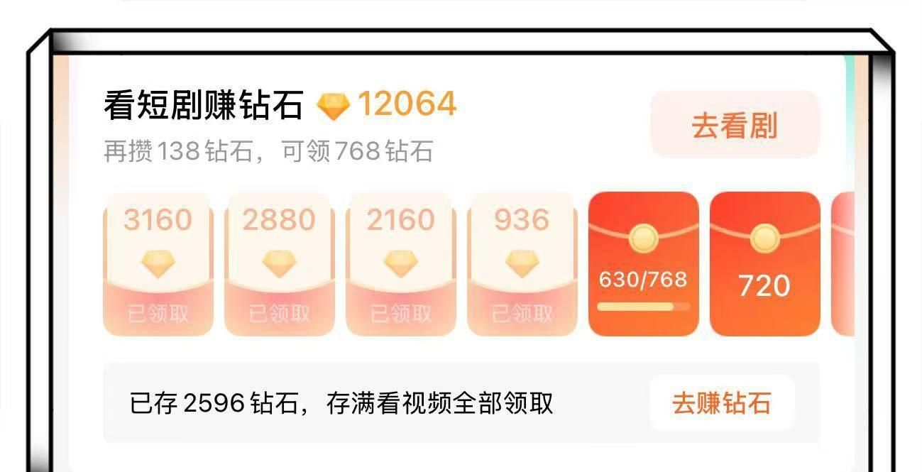 如果没有把短剧时长拉满,导致红包未完全解锁,该任务给予的钻石奖励就会持续减少。