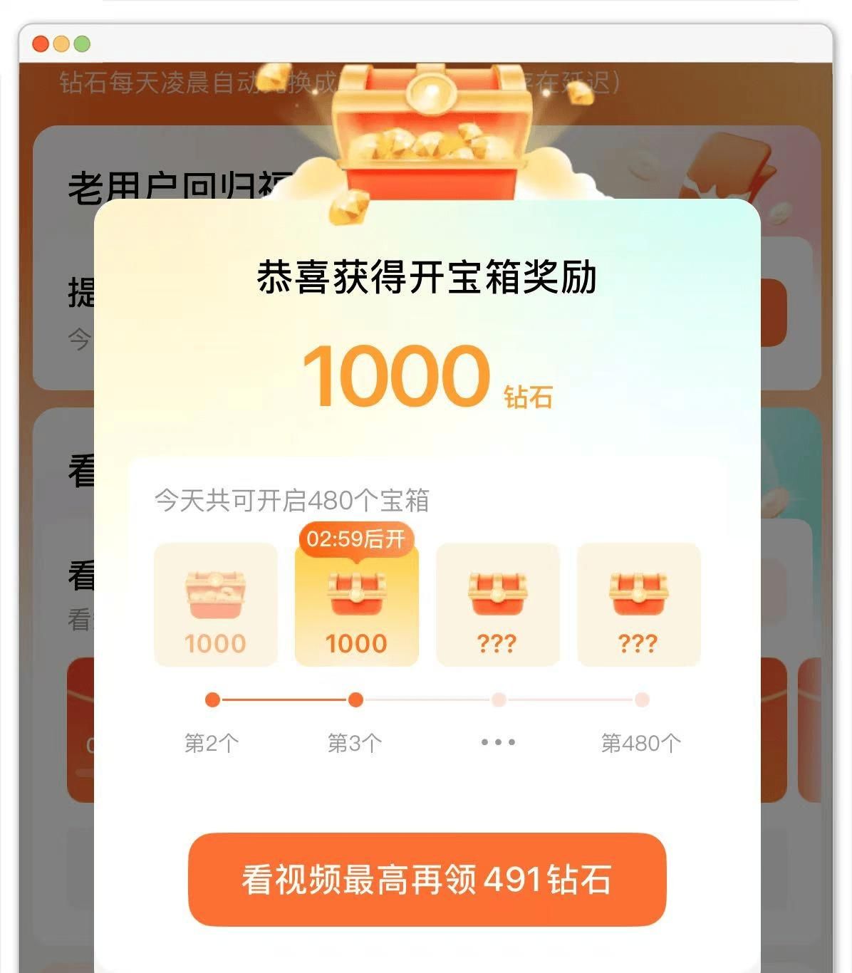 前四个宝箱基本会稳定产出1000钻石,并附带4个广告视频,这些广告视频的钻石额度高低与转化效果直接相关。