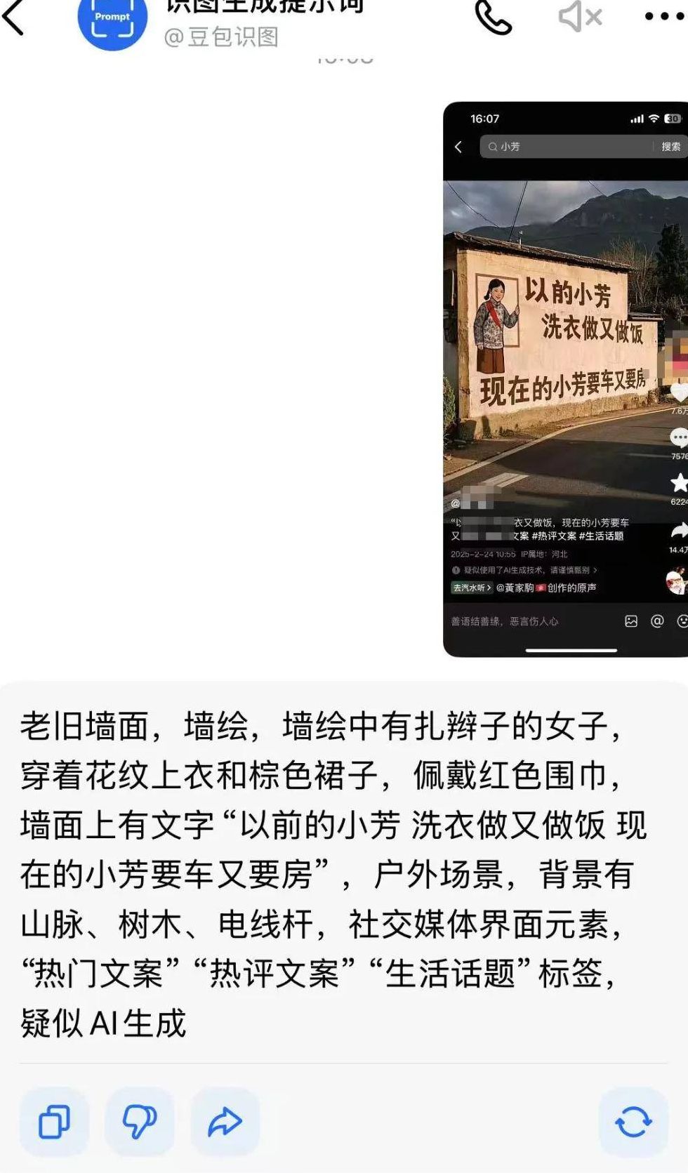 我首先会找到同行的优质作品,截图保存下来。接着打开豆包APP,使用其"识图生成提示词"功能。我发现只要上传保存的截图,就能快速提取出对应的生成指令。