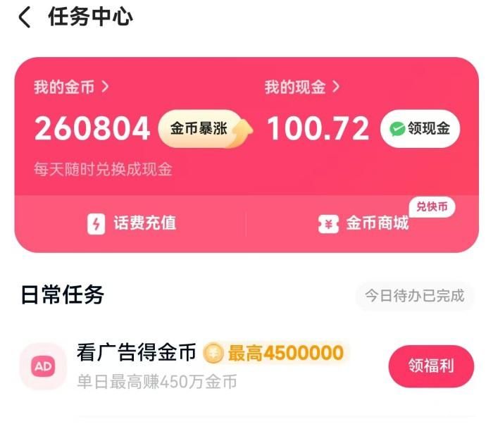 在抖音极速版、快手极速版、今日头条极速版、腾讯视频、番茄小说等平台,完成广告任务、刷视频、参与其他金币活动,就能获得金币奖励兑换现金收益。