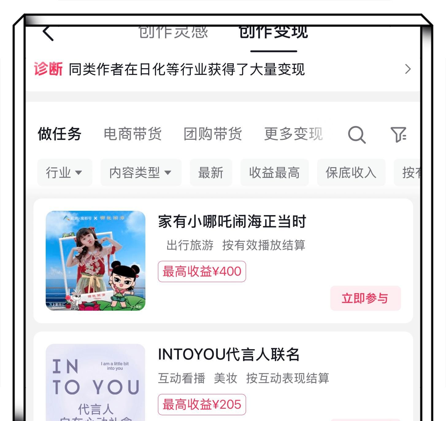 抖音创作者中心的这些视频任务,本质上是为品牌增加曝光量的营销方式,因此不少知名大品牌都会在平台发布这类任务。另外,如果你刚好要出门游玩或吃饭,还可以选择团购带货类的视频任务,在视频下方挂载对应链接,只要有用户通过链接消费,你就能获得相应的分佣奖励。