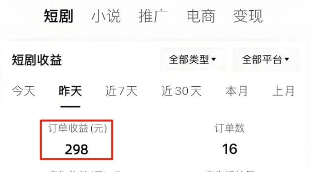 因为短剧推广的收益逻辑很清晰:收益=视频流量 × 订单转化 × 佣金比例,流量越高、转化越好、佣金比例越高,最终到手的收益就越多。