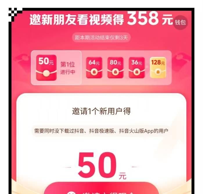 官方app里本身就有这个活动,但是要求很高,需要同时满足是抖音、抖音极速版、抖音火山版三个app的全新用户,才能拿到收益。现在抖音用户覆盖率这么高,很难找到符合要求的新用户。