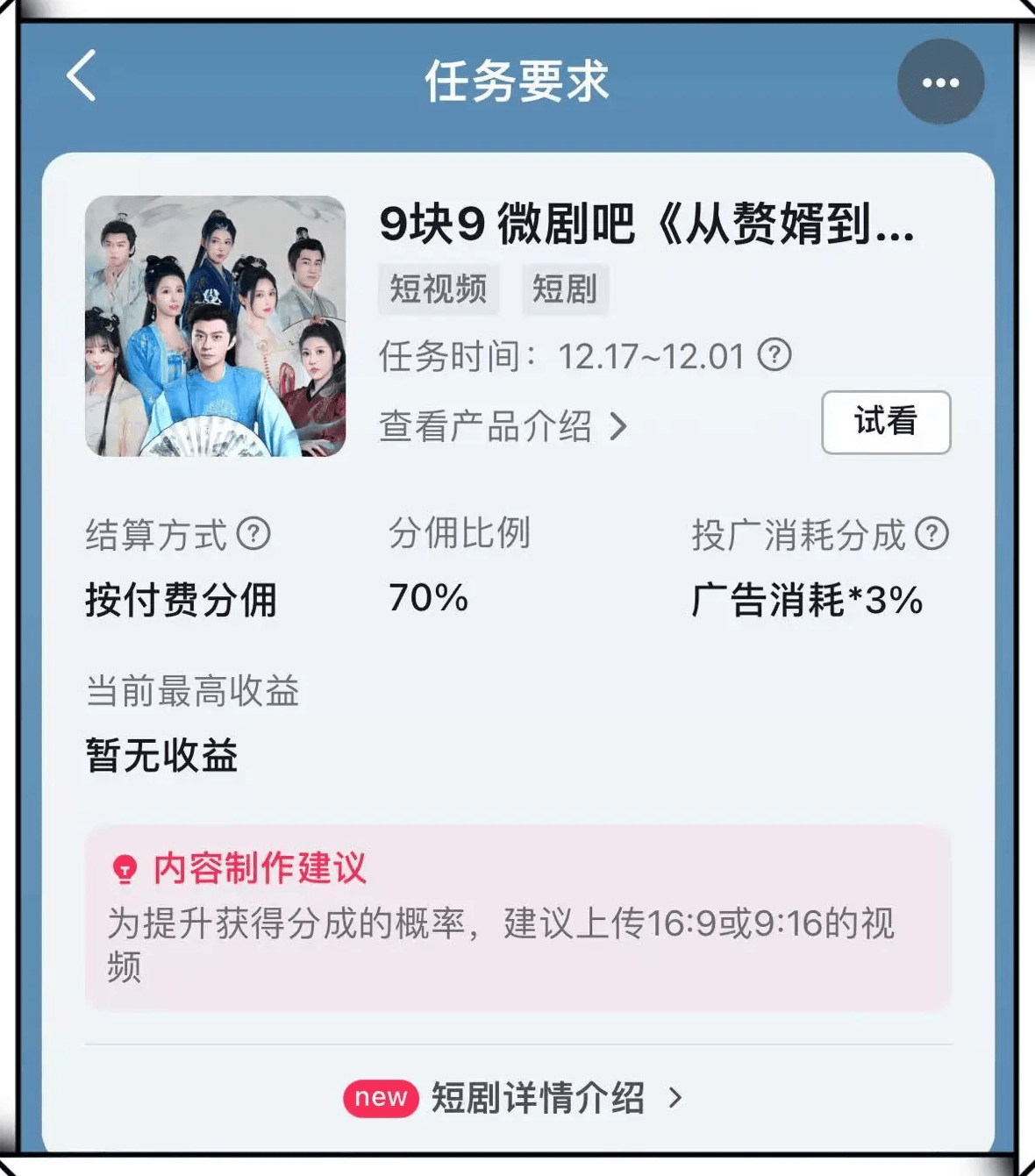 简单来说,只要有用户通过你的视频跳转至短剧平台观看内容,你就能拿到一笔推广佣金。完全是多劳多得,哪怕用户没有产生付费行为,你照样能获得收益,没有任何风险。