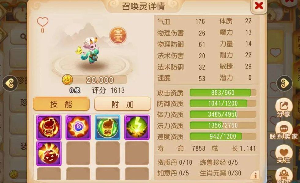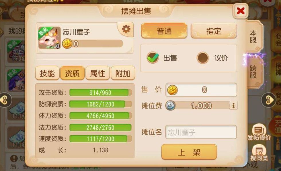 这只合宠产出的忘川童子,成长值1.14,法力资质1356,攻击资质883,各项资质都很差,所以只能卖2万金币。