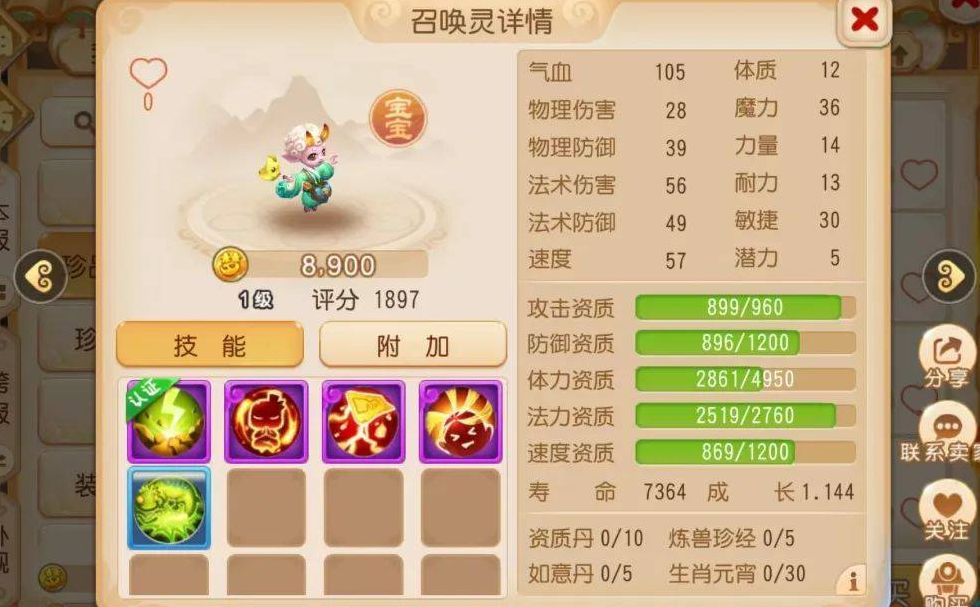 一旦洗出珍品宠物,打开资质面板就能看到,它的各项属性数据都十分亮眼。