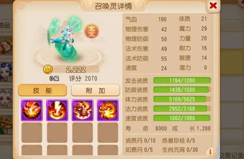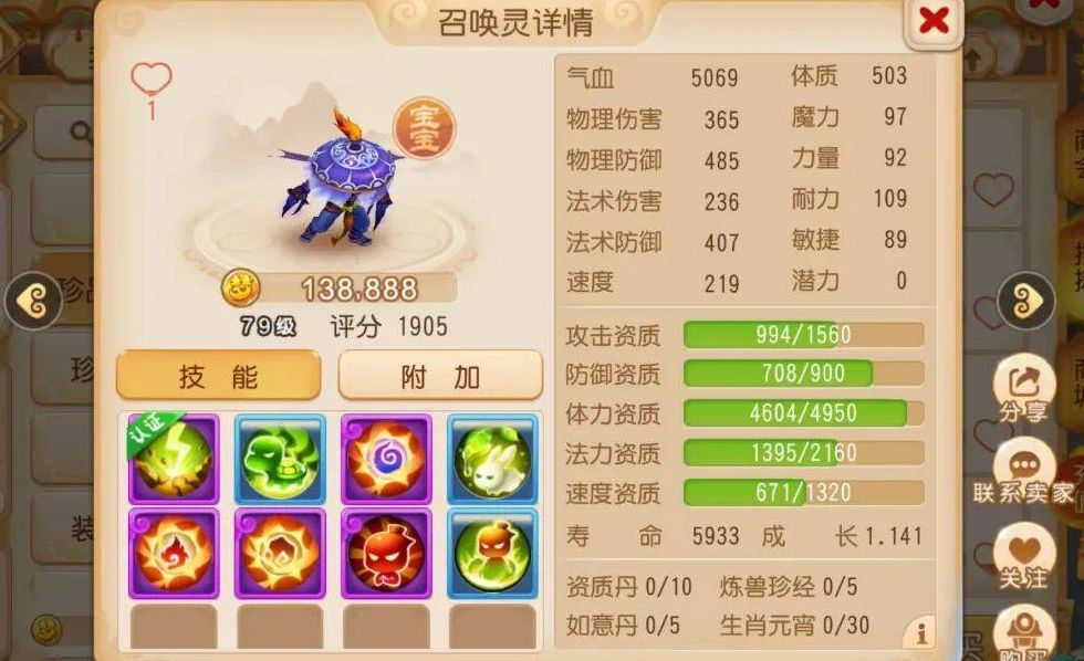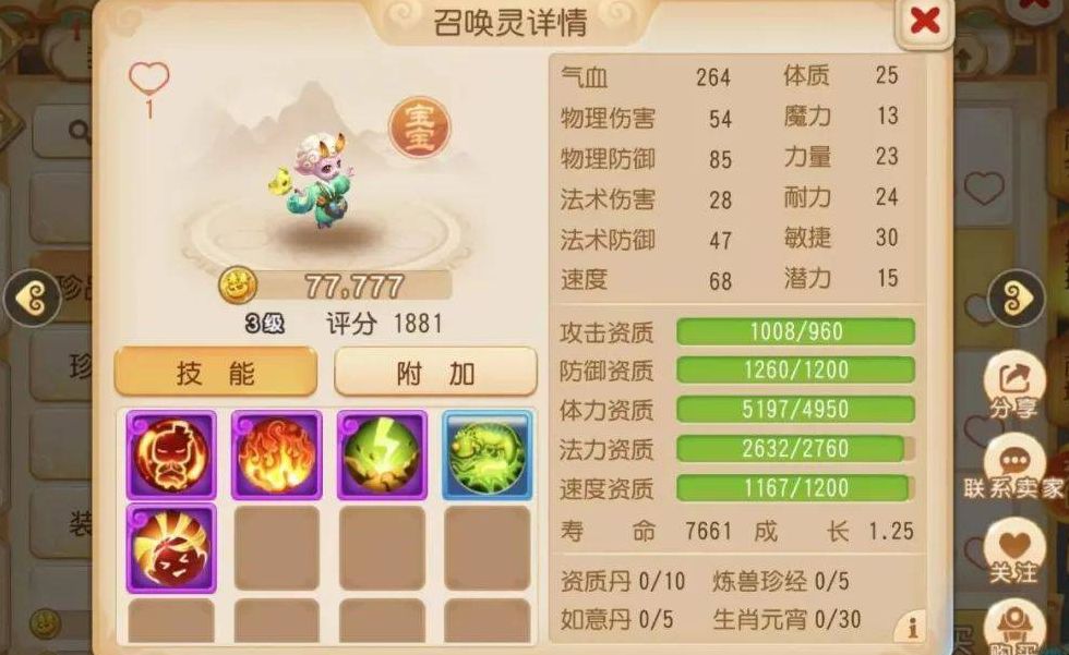 下面这只忘川童子就完全不同了,成长值1.25,法力资质2632,攻击资质1008,其他资质也都十分顶尖,因此能卖到7万金币。