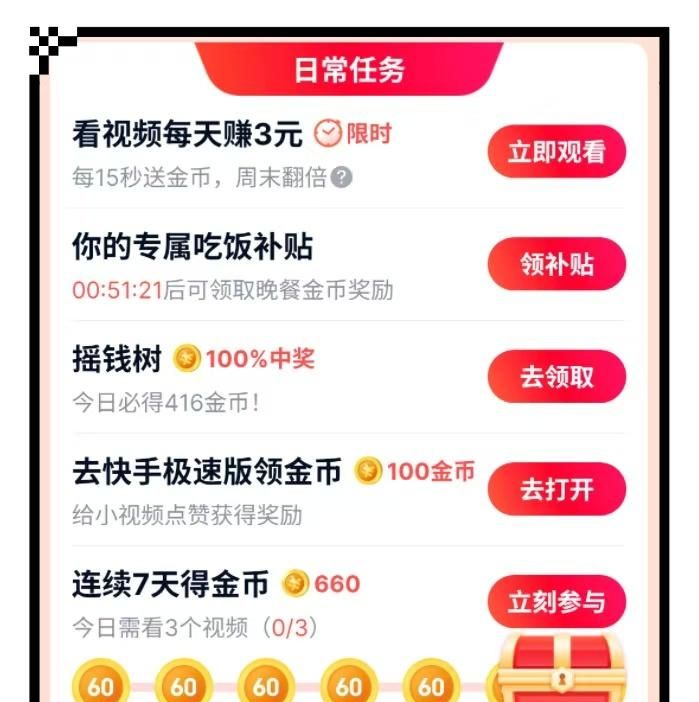 作为抖音的核心竞争对手,快手始终与抖音保持着对标态势,因此两者的极速版APP也几乎是同期上线的产品。快手极速版的赚钱模式,和前文提到的抖音极速版大致相似。用户在任务中心完成签到、开宝箱、看广告、领取饭补等任务,就能轻松实现边玩边赚。掌握一定的养号技巧后,单靠看广告一天就能赚取约10元的收益。