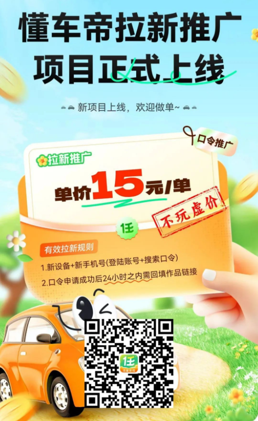 兼职副业新选择,懂车帝拉新项目一单15元,一天赚个大几百不成问题!