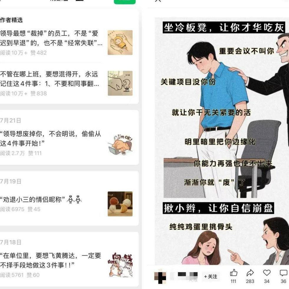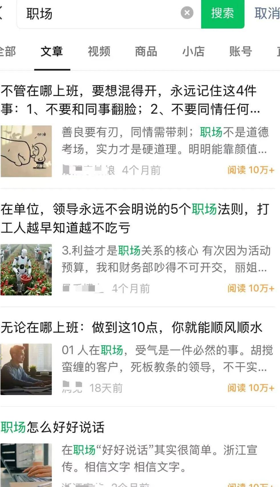 其基本逻辑是,通过发布同事相处、向上管理、效率提升等职场主题内容吸引用户阅读。理论而言,有价值的知识内容确实能带来流量。但这里存在一个常见问题:同质化。在微信中搜索“职场”,不难发现爆款文章数量众多,这也意味着竞争异常激烈,若内容缺乏独特性,很容易被淹没。