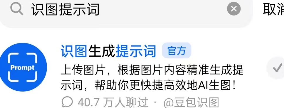 第一步,搞定AI的“指令密码”,也就是提示词。最快的方法是什么?直接扒爆款视频的现成提示词。打开“豆包”APP,首页直接搜“识图生成提示词”,找带官方标的入口点进去。