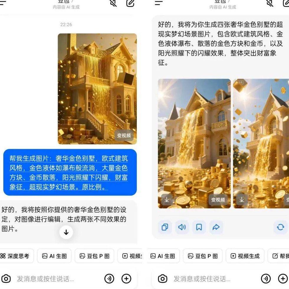 第二步,一键生成视频。还是在豆包里,点击下方的“AI生图”,把刚才复制的提示词粘贴进去,AI很快就能给你生成四张图。不用纠结,凭第一感觉随便选就好。