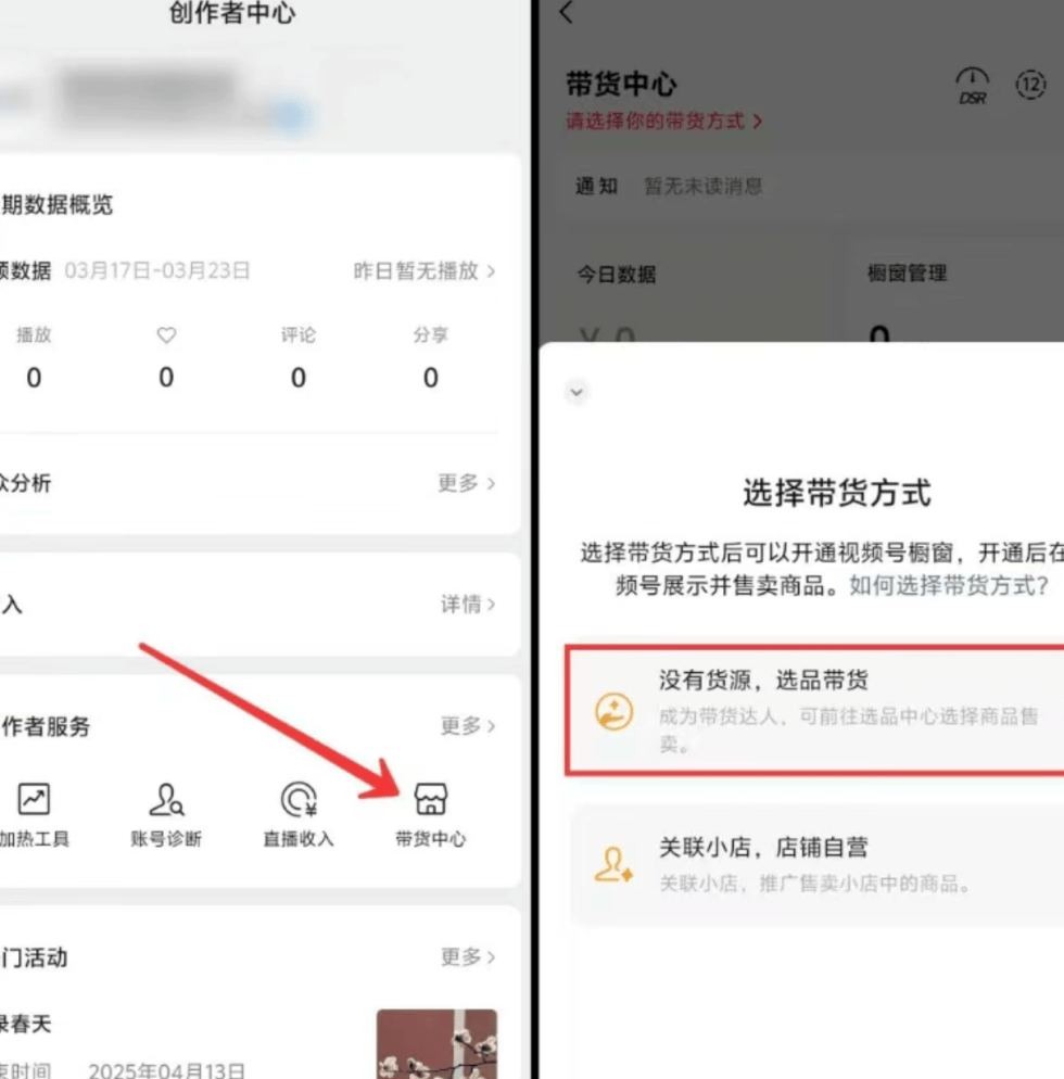 打开微信,点击底部的「发现」进入视频号,接着找到「创作者中心」-「带货中心」-「去选品」,选择「无货源」模式即可。