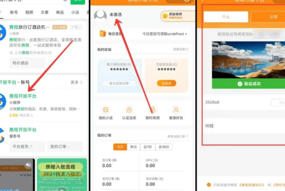 旅游类货源我们直接绑定携程就行,在微信里搜索「携程开放平台」,登录后完成账号激活。