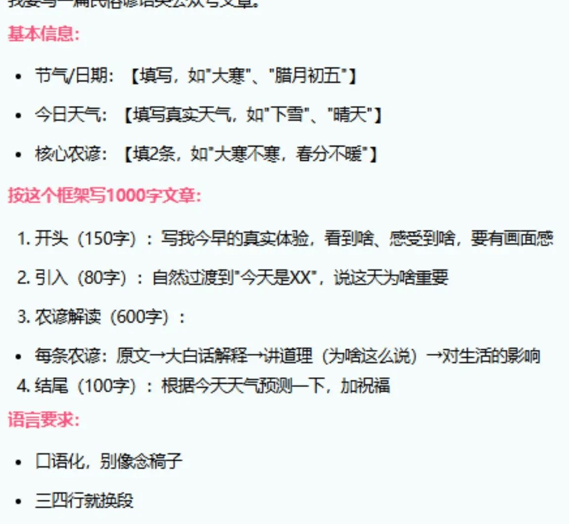 所以说啊,很多时候我们并非执行力不行,只是缺了一个找对方向的方法。今天我就来给大家好好分享一下,这类农谚民俗号该怎么选题、怎么成文,最后还会附上关键的AI提示词。