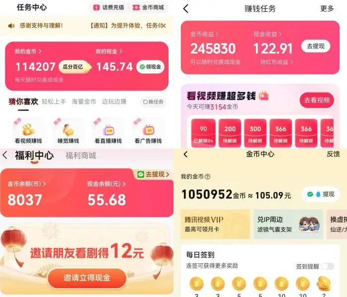 玩法很简单:刷视频、看广告、签到、开宝箱,都能赚金币。金币可以兑换现金,金额达到提现门槛就能直接拿钱。