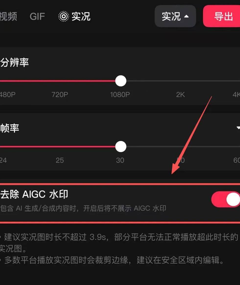 最后一步,我会在剪映里选择「实况」模式导出,还会特意去掉AIGC生成的水印。