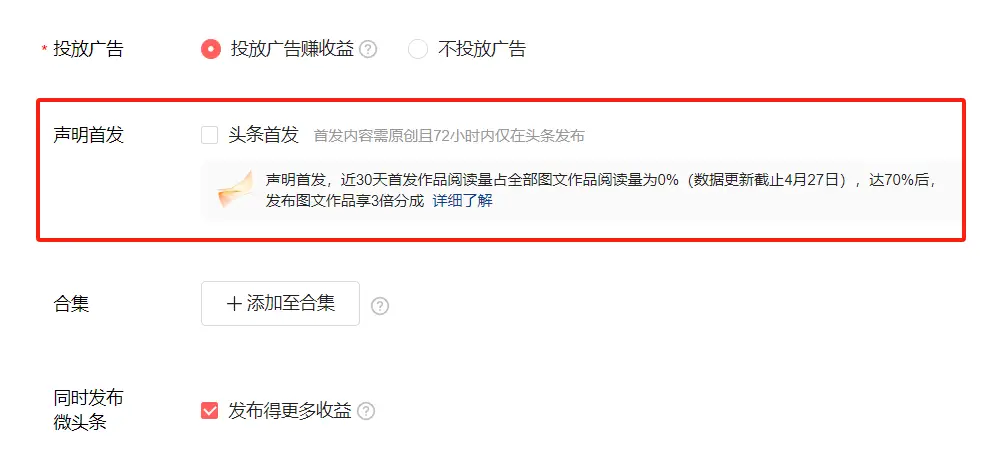 头条有“首发声明”的奖励机制。文章选择首发,平台会给额外的流量扶持。建议文章先在头条发,等48小时后再同步到其他平台。这样能拿到更多流量。