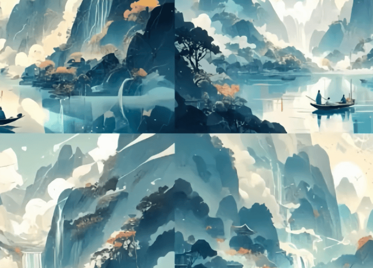 输入分镜头提示词并点击生成,AI会生成与诗意匹配的画面,通常会生成四张候选图,从中选择最贴合诗词意境的作品。