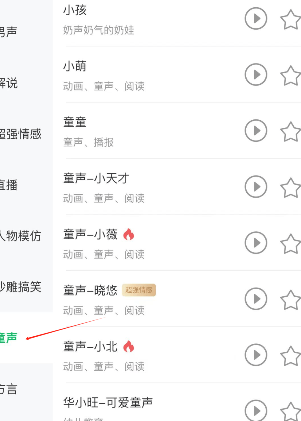 第三步:AI配音。将古诗词及注解通过AI配音工具生成音频,营造少儿朗读的听感。多数AI配音工具都提供专门的童声选项,可根据喜好选择声音风格,如奶萌或治愈系童声,试听后选定合适的声音,调整语速即可导出。